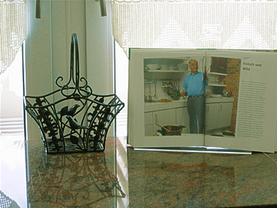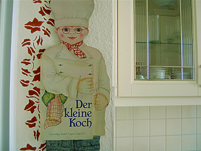 | Diesen kleinen Koch fand ich, man glaubt es kaum, auf einem Flohmarkt in Erlangen. Zusammen mit der von mir selbstgemalten Bordüre pass er sich perfekt in die Küchenumgebung ein.