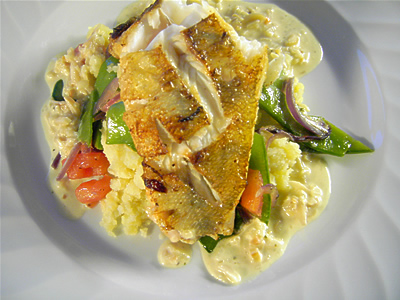 Gebratenes Zanderfilet auf Gemüse mit Stampfkartoffeln