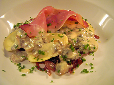 Auf vorgewärmte Teller zunächst mit einem Löffel die Zwiebel mittig verteilen. Mit einem Schaumlöffel 3-4 Tortelli aus dem Wasser heben, gut abtropfen lassen und noch über ein doppeltes Küchenkrepp ziehen. Dann auf die Zwiebeln verteilen. Die Sahneschaumsoße mit den Champignons darüber geben und eine Scheibe Schwarzwaldschinken dekorativ dazu legen- mit frischem Schnittlauch bestreuen. Fertig!