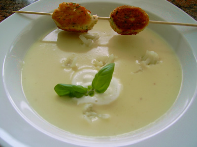 Blumenkohlcremesuppe mit gebratenen Garnelenklößchen