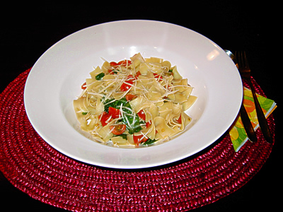 Die Nudeln in ausreichend Salzwasser bissfest kochen. In ein Sieb abgießen und wieder in den Topf zurückgeben. Die angemachten Tomaten mit dem Bärlauch komplett dazu gießen. Etwas Muskatnuss darüber reiben. Mit einer Gabel vorsichtig durchheben und gleich auf die Teller anrichten. Frischen Parmesan darüber reiben, die gerösteten Pinienkerne darüber streuen und auf jeden Teller noch einen Schuss Olivenöl geben.