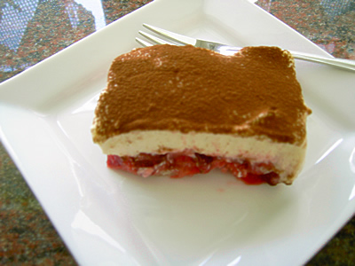 Eine viereckige Auflaufform mit den Löffelbiskuits eng auslegen. Dabei die gezuckerte Seite nach unten legen. Mit den 120 ml. abgenommenem Erdbeersaft tränken. Mit einem Pinsel geht das gleichmäßig. Dann mit den nun ganz abgekühlten Erdbeerkompott gleichmäßig bedecken.