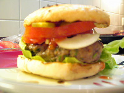 Die untere Hälfte des Brötchens auf einen Teller legen. Mit Ketchup bestreichen. Salatblätter darauf legen. Auf den Salat kommt das gebratene Rindfleisch-Pallett. Nun eine Scheibe Cheddar-Käse. Darauf einige Scheiben Tomate, einige Scheiben Gewürzgurke und einige Zwiebelscheiben. Nun kommt der Senf obendrauf und auf den Senf wird das Oberteil des Brötchens geklebt.