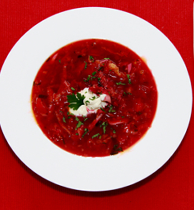 Borschtsch wird traditionell entweder in Schalen oder in tiefen Suppentellern serviert. Was nicht fehlen darf ist mit einem Esslöffel abgestochene Nocke Schmand. Garniert wird mit gehackter Petersilie.