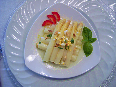 Entnehmen Sie sich für 1 Portion etwa ¼ des Spargels und legen Sie diesen auf ein Schneidebrett. Dabei richten Sie alle Köpfe in einer Linie aus. Halbieren Sie mit einem scharfen Messer die Spargelstangen. Legen Sie zuerst die Stiele, dann um 90° verdreht die Spargelspitzen aufeinander. Geben Sie etwas vom Dressing darüber. Nun nur noch ausgarnieren mit einem Basilikumblatt, Erdbeerscheiben, Eierwürfeln, Pinienkernen und zum Schluss grob gehobelten Parmesan. Wenn Sie möchten mahlen Sie mit einer Pfeffermühle noch ein wenig bunten Pfeffer darüber.